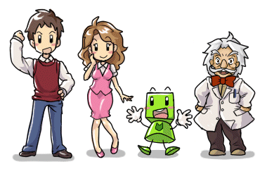 スクエアリングサービスの「スクエア」とは「四角」であり、実は同音の「資格」を指しています。 「四角四面」という音が「資格支援」に近いことから発想したネーミングになります。 つまらないダジャレで申し訳ないのですが、ネーミングが先行したため、そのまま押し通しています。 エンジニアの技術知識やスキルを二乗するという意味で「スクエア」を採用しています。 「スクエアリング」といった進行形の表現を採ったのには、楽しみながら学習に利用していただきたいという意図があります。 模擬試験のシステムと模擬問題はマッド博士により開発されました。スクエア君はマッド博士のアシスタントです。 スクエア君がサービスを案内し、指南してくれます。という軟らかいコンセプトで今後はサービスを構成していく予定です。 今後の展開をご期待ください。メンバをご紹介しておきます。 右からマッド博士、スクエア君、その隣は学習者のまどかさんといおり君です。 |